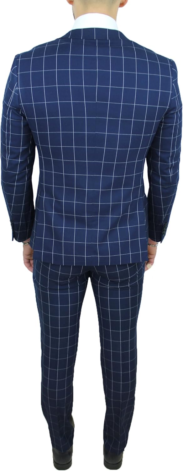 Abito Uomo Elegante Giacca Pantaloni Completo Blu Scuro Slim Quadretti Scozzese Giosal