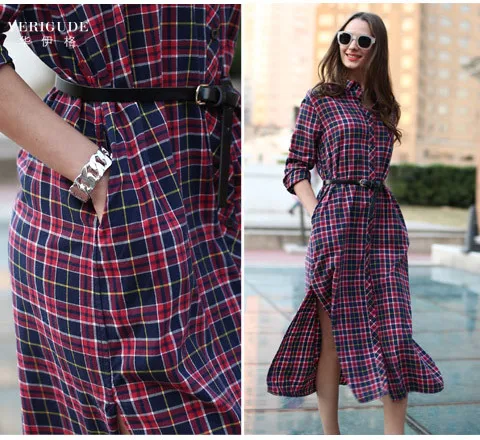 Veri Gude Lungo Abito Camicia A Quadri Manica Lunga Del Cotone Delle Donne Lungo Chemisier Per L Autunno Spaccati Sul Lato Vestito Delle Donne Plus Size S Xxl Shirt Dress Long Plaid Shirt Dresslong Plaid