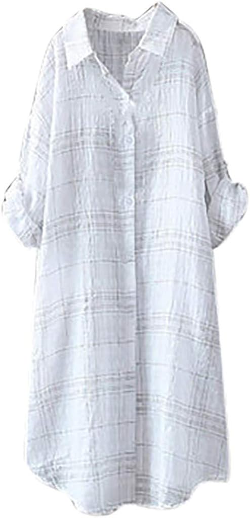 Donna Jurtee Camicetta Donna Elegante Maniche Lunghe Taglie Forti Cotone E Lino Blusa Lungo Bottoni Abito Camicia A Quadri Allentata T Shirt Abbigliamento Laaldeasanicolas Es