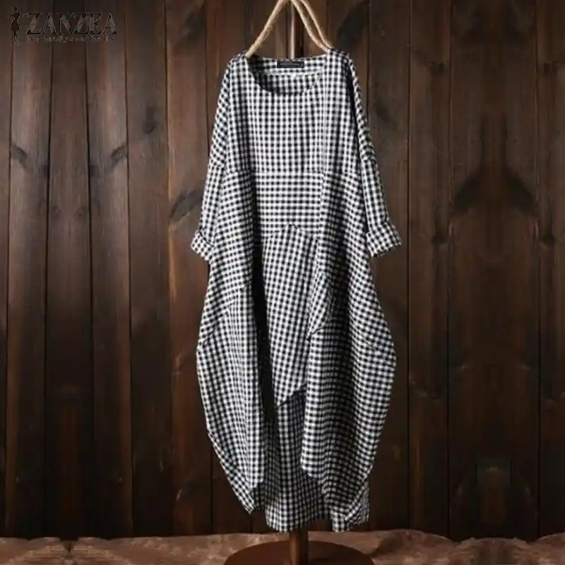 Zanzea Autunno Vintage Plaid A Quadri Vestito Delle Donne Manica Lunga Asimmetrica Hem Vestito Estivo Femminile Retro Di Cotone Di Tela Lunga Vestido 5xl Abiti Aliexpress