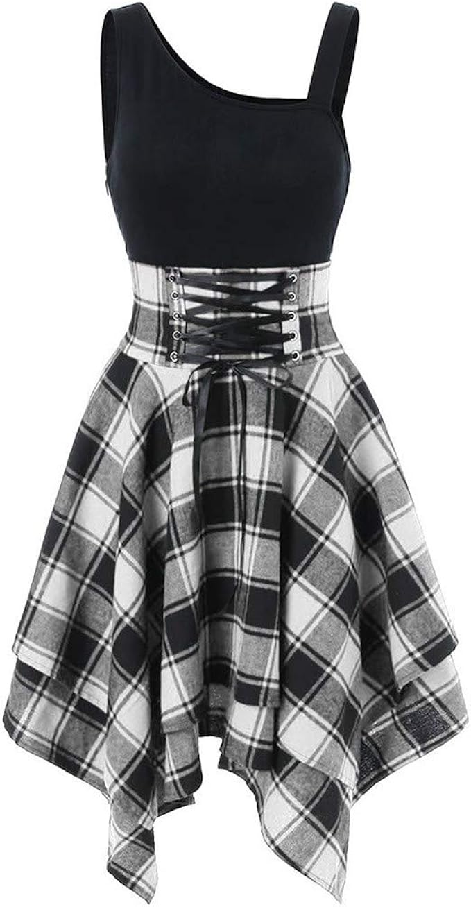 Xbowo Dress Donna Lunghi Gonne Lungo Elegante Vestito Abito Canotta Da Donna A Maniche Corte A Quadri Retro Banda Larga Canotta Da Donna Abito Casual Amazon It Abbigliamento