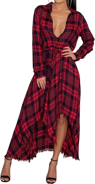 Szivyshi A Maniche Lunghe Scollo A V Bottoni Fondo Asimmetrico Irregolare Frange Plaid Quadri Quadretti A Pieghe Lungo Lunga Maxi Skater A Line Linea Ad A Svasato Camicia Vestito Abito Nero Rosso Xl