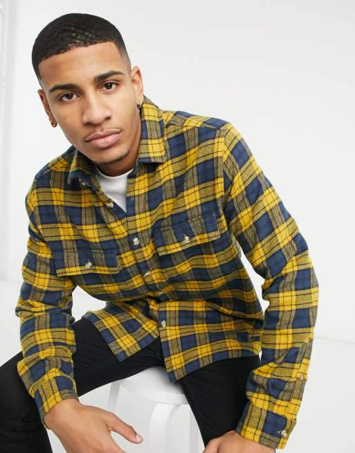 Asos Design Camicia In Flanella Spazzolata A Quadri Scozzesi Blu E Gialli Con Tasche Sul Petto Asos