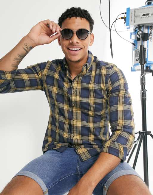Asos Design Camicia Boyfriend A Maniche Lunghe Blu Navy E Senape A Quadri Asos
