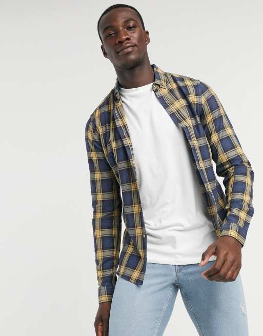 Asos Design Camicia Slim Stretch Gialla E Blu Navy A Quadri Asos