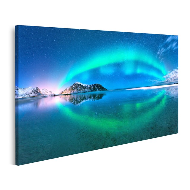 Canvas Wall Art Aurora Reflected In Water Northern Lights In Lofoten Islands Norway Blue Sky With Polar Lights Night Landscape With Aurora Sea With Sky Reflection Beach Mountains Pol Amazon Co Uk Kitchen