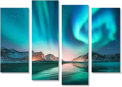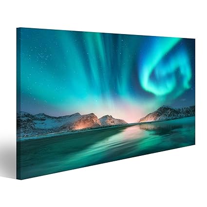 Canvas Wall Art Aurora Reflected In Water Northern Lights In Lofoten Islands Norway Blue Sky With Polar Lights Night Landscape With Aurora Sea With Sky Reflection Beach Mountains Pol Amazon Co Uk Kitchen