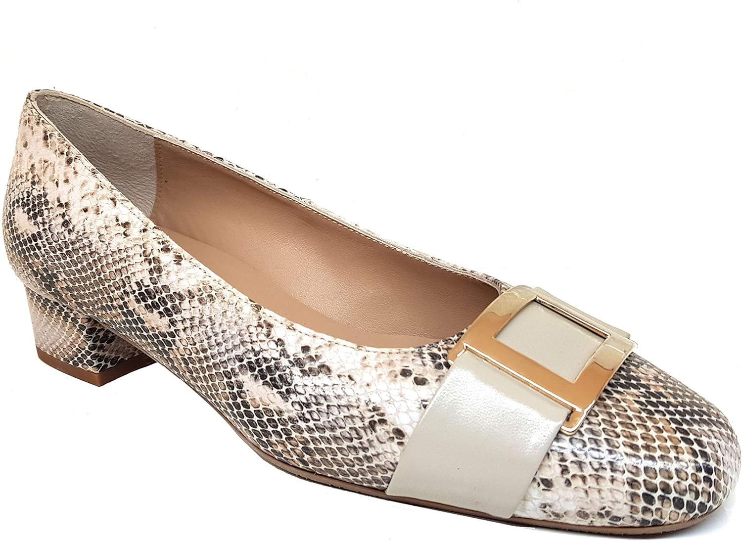 Opera Ballerine Da Donna In Pelle Stampata Serpente Con Tacco Basso 2 Cm Punta Quadrata E Fibbia In Metallo In Oro Zecchino Eleganti Mocassini Casual Con Stampa Animale Beige