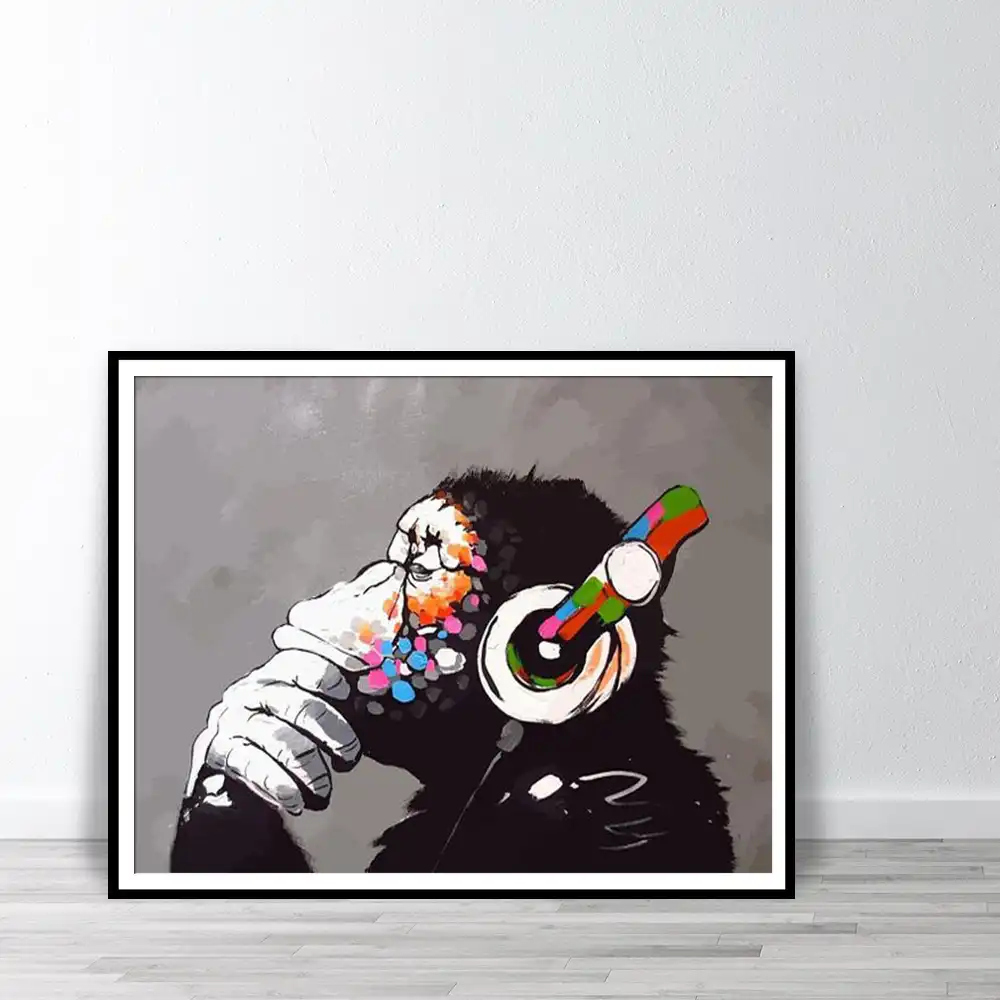 Banksy Monyet Dengan Headphone Dinding Art Warna Warni Simpanse Mendengarkan Musik Earphone Printing Street Art Graffiti Painting Calligraphy Aliexpress