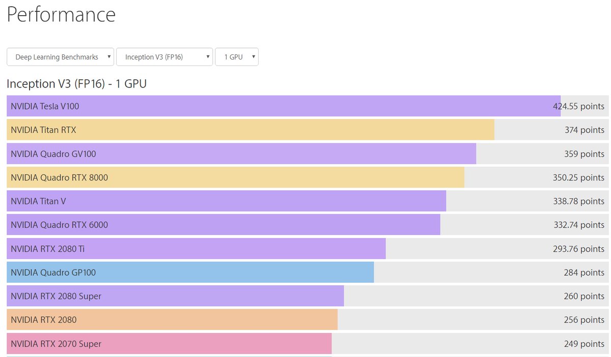 Rodger On Twitter Bizon Tech Graphic Of Gpu Performance Deep Learning Benchmarks Inception V3 Fp16 Best Nvidia Tesla V100 424 Points Nvidia Rtx 2080 256 Points Nvidia Gtx 1080 177 Points Nvidia