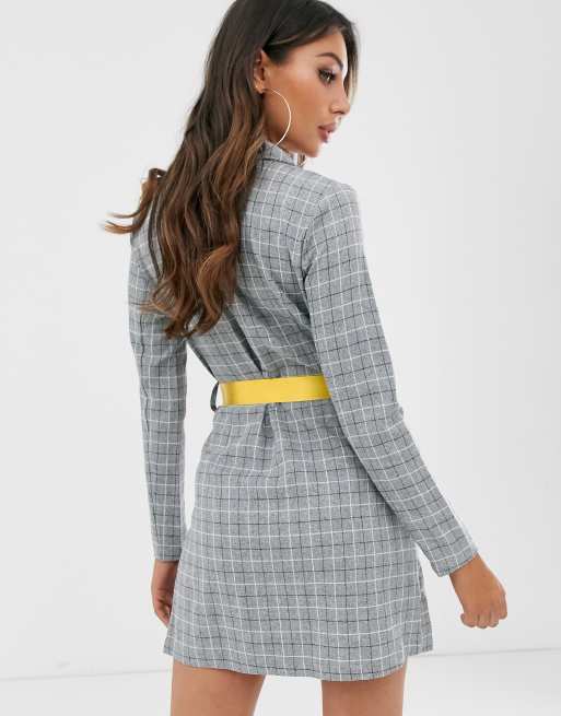 Lasula Vestito Stile Blazer Grigio A Quadri Con Cintura Gialla A Contrasto