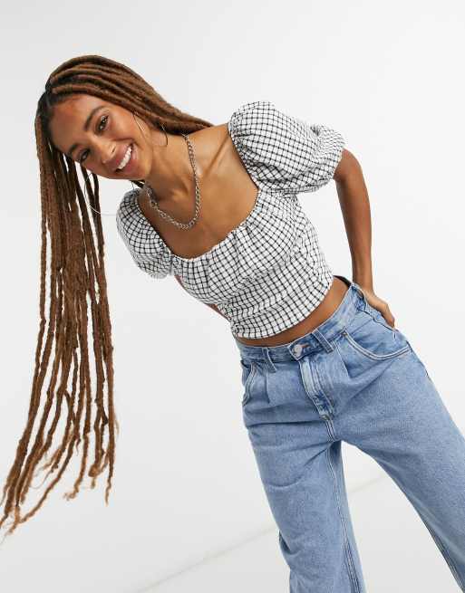 Bershka Blusa Corta Bianca A Quadri Con Maniche A Sbuffo Iebem Morelos