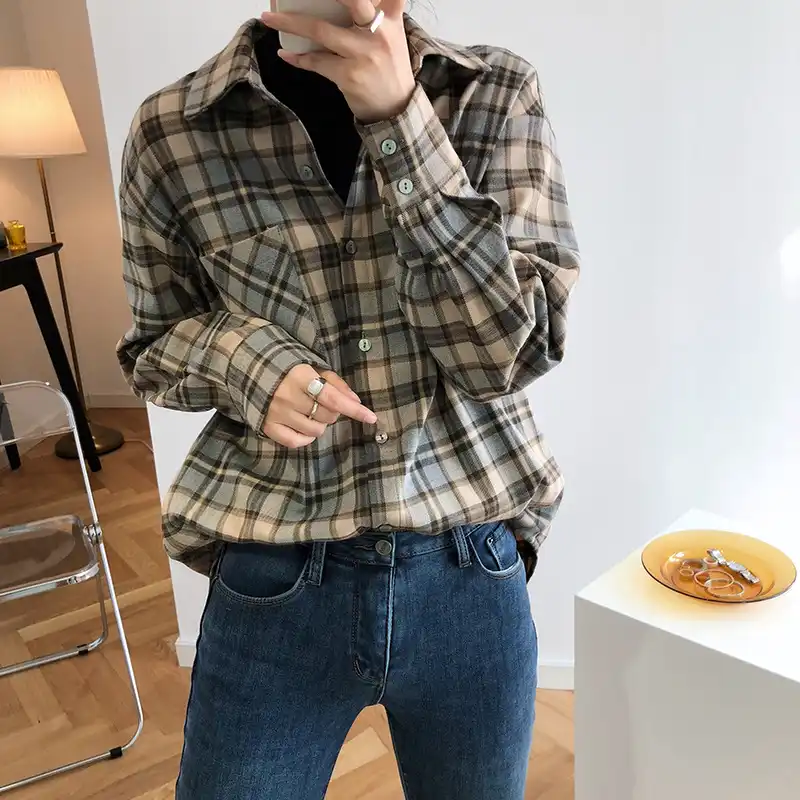 Camicia A Quadri Stile Retro Camicetta Da Donna All Match Per Autunno Inverno Camicia Da Donna Casual Allentata A Maniche Lunghe Con Risvolto Sabbiato Di Nuova Moda Camicette E Gonne Aliexpress