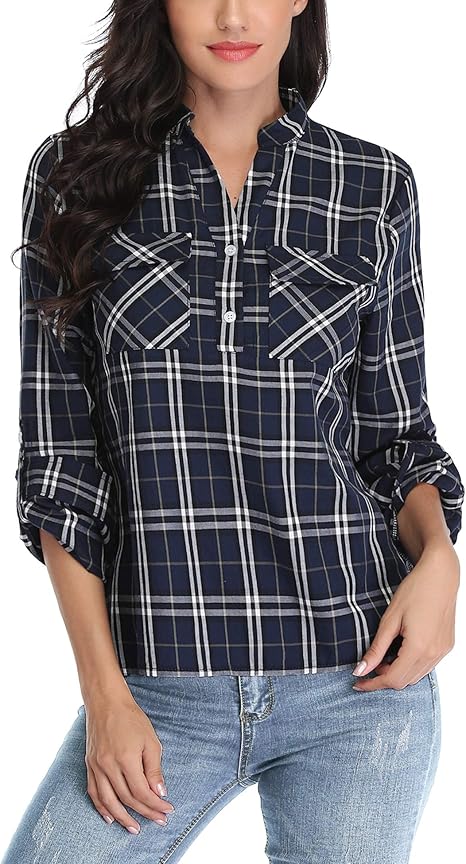 Abbigliamento Abollria Camicia A Quadri Flanella Da Donna A Lunga Manica Blusa Camicetta A Quadri Classica Con Tasche Bluse E Camicie