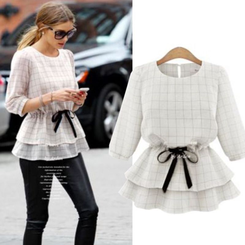 Acquista Camicetta A Collo Rotondo Camicia A Quadri Bianca Blu Top Da Donna Vita Con Coulisse Camicette Da Donna Mezza Manica Top Peplo Blusa 910429 1731 A 23 8 Dal Pinkcolor Dhgate Com