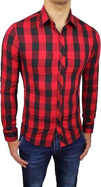 Camicia Uomo Casual Fantasia Quadri Nero Rosso Slim Fit Aderente Elasticizzata Amazon It Abbigliamento