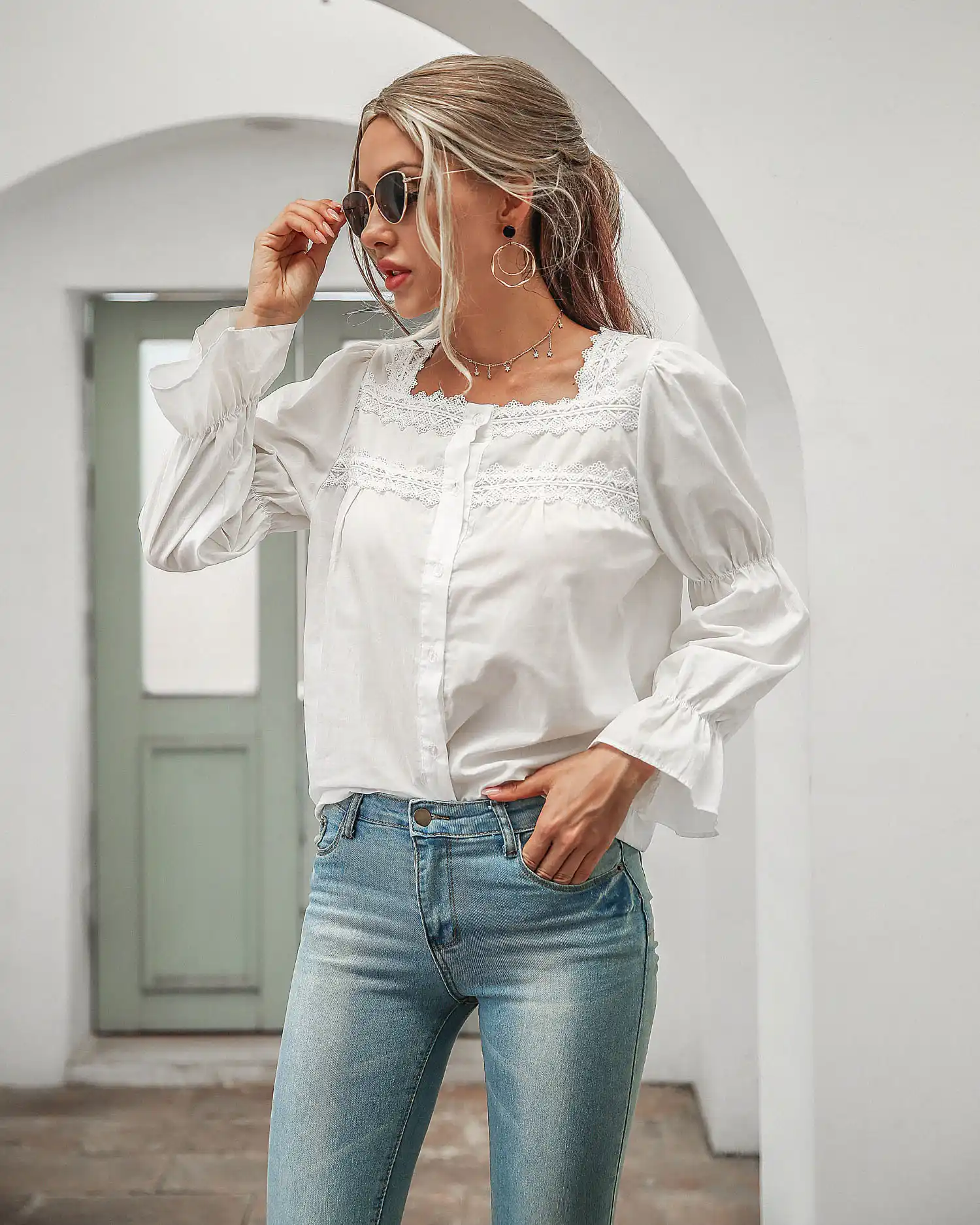 Autunno 2020 Del Collare Quadrato Campana Manica Lunga Camicetta Delle Donne Camicia Bianca Rappezzatura Del Merletto Elegante Signore Ufficio Magliette E Camicette Y1325a Aliexpress