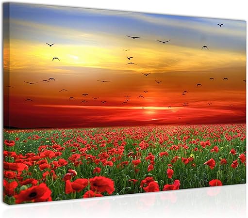 Quadro Stampa Su Tela 70x50cm Campo Di Tulipani Fiori Rossi Al Tramonto Rondini E Sole Fantasia Colori Vivaci Decorazioni Interni Amazon It Casa E Cucina