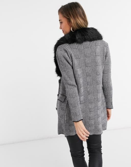 Liquorish Cappotto Dritto Grigio A Quadri Con Colletto Nero In Pelliccia Sintetica Asos
