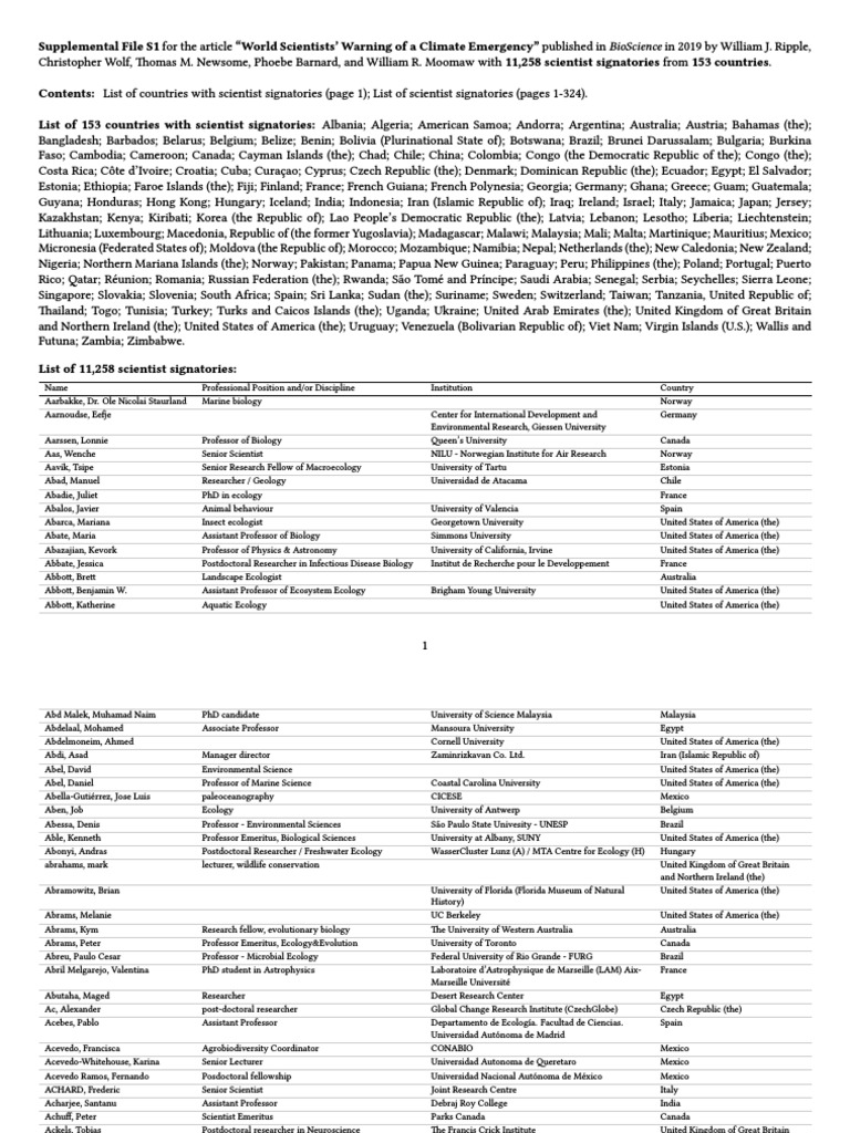Supplemental File S1 Signatory List Ripple Et Al 10 14 19 Pdf Ecology Doctor Of Philosophy