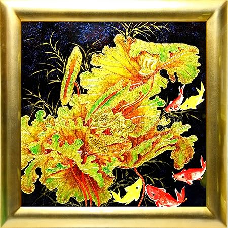 Quadro In Legno Laccato Verniciato Cod 7d 8469cd 72 X 72 Cm Con Cornice Dorata Fiore Di Loto E Pesci Carpa Koi Artigianato Del Vietnam Amazon It Casa E Cucina