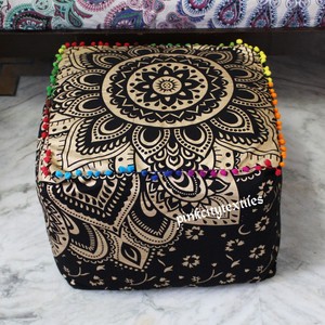 18 Quadrato Pouf Ottomano Copertura Indiano Nero Golden Mandala Sedile Poggiapiedi Caso Ebay