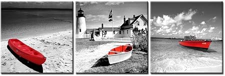 Amazon Com So Crazy Art Black And White Wall Art Decor Red Boat Sailboat And Lighthouse On The Beach Canvas Pictures Artwork 3 Panel Seascape Painting Prints For Home Living Dining Room Kitchenints
