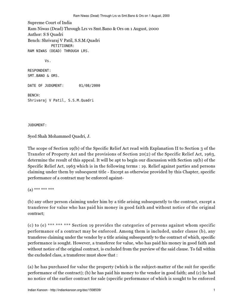 Ram Niwas Dead Through Lrs Vs Smt Bano Ors On 1 August 2000 1 Equity Law Lawsuit