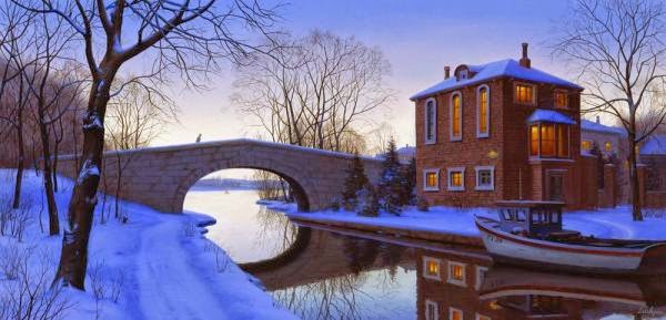 Schnee Baume Haus Malerei Nacht Gebirge Winter Hauser Fluss Zwielicht Boote Ein City Painting Oil Painting Landscape Landscape Paintings