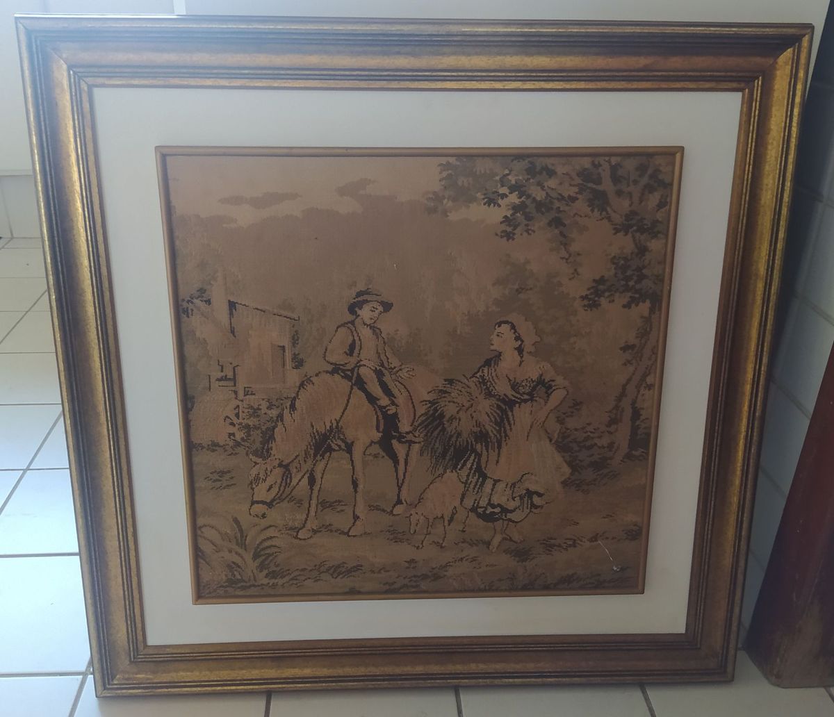 Quadro Tapecaria Gobelin E Moldura Dourada