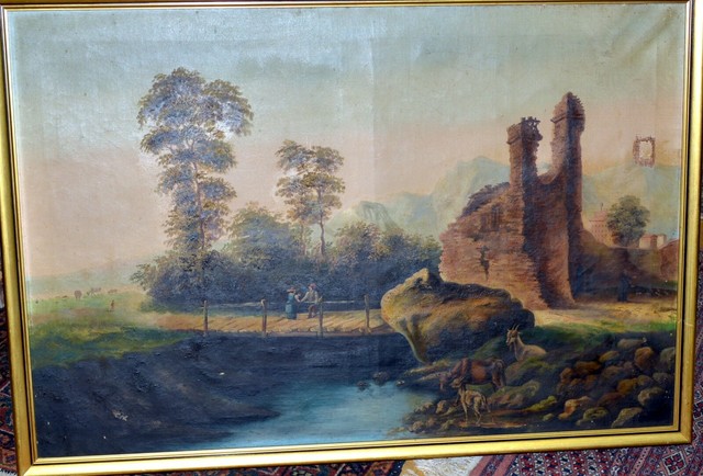 Antico Grande Quadro Dipinto Olio Tela Paesaggio 1800 Ponte Fiume Rustico Capre Ebay