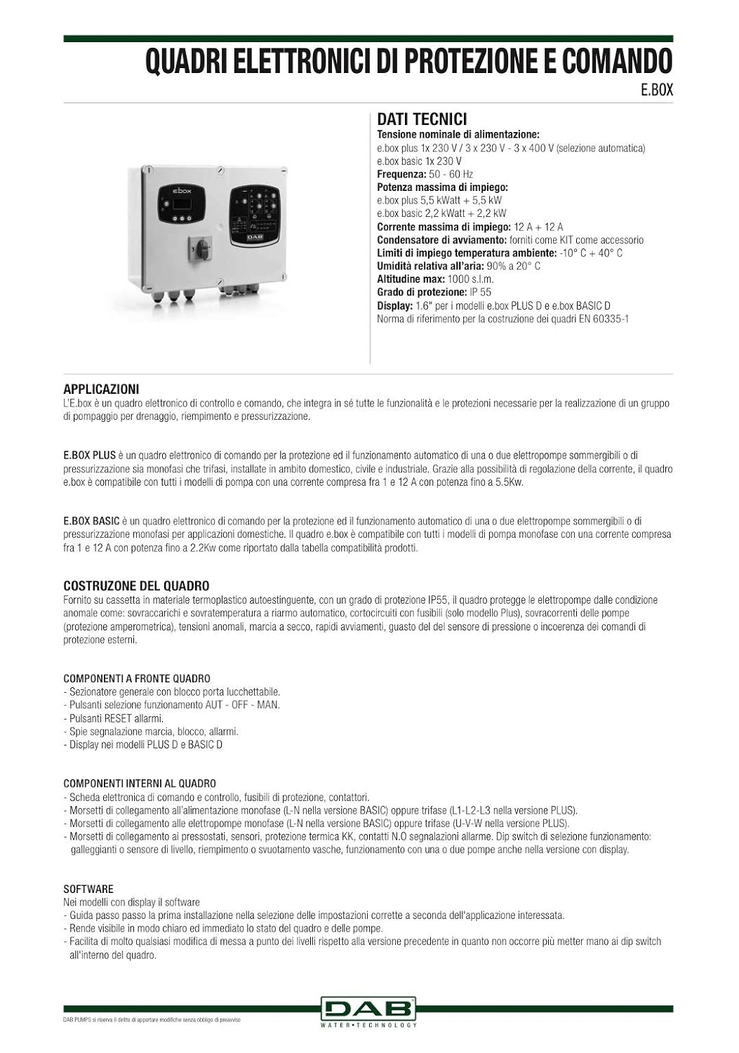Dab Ebox Basic 230 50 60 Quadro Elettronico Di Controllo E Comando Automatico Protezione Delle Elettropompe Uso Domestico Civile Industriale Amazon It Commercio Industria E Scienza