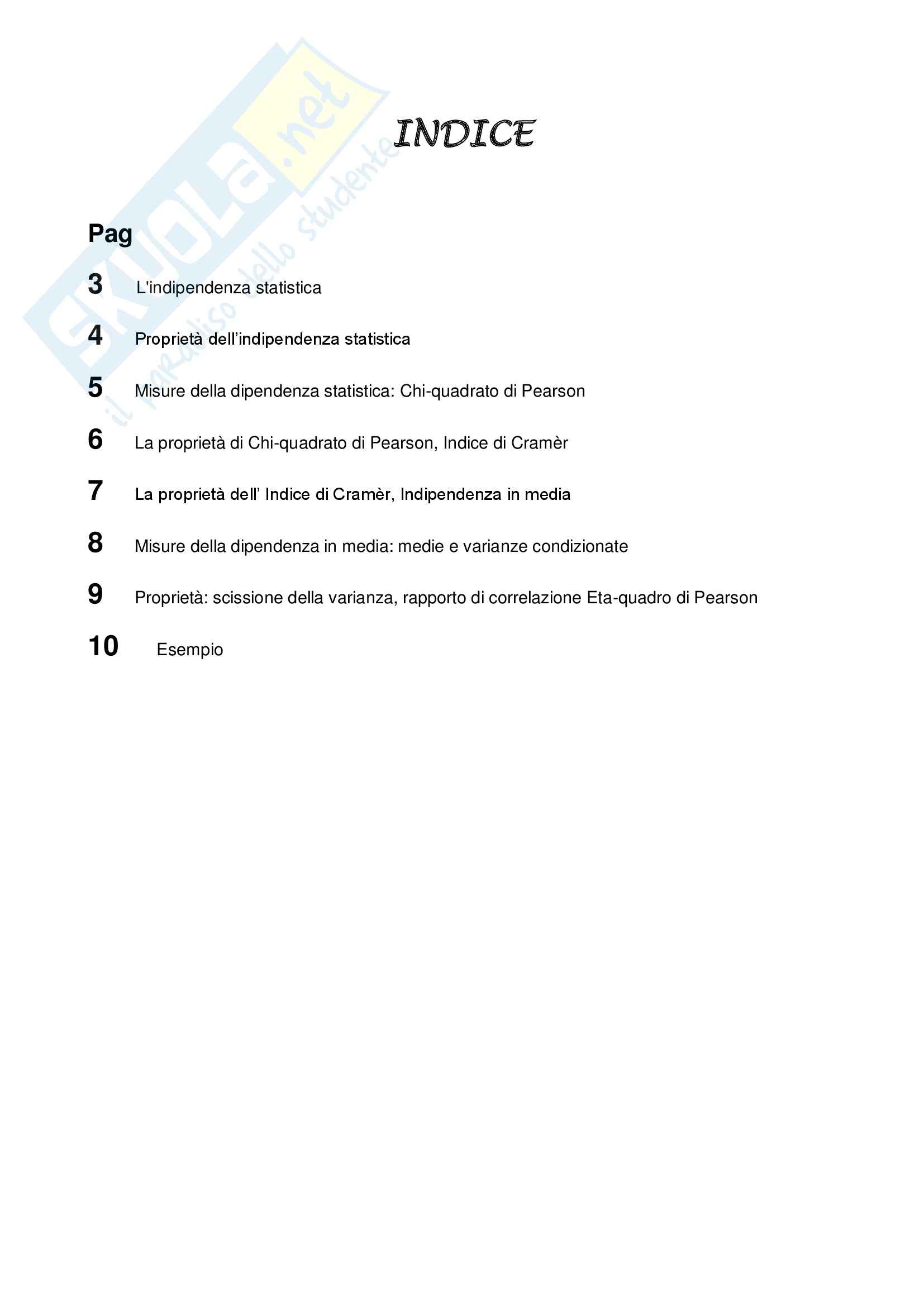 Dividi il chi quadrato per n trovando l indice di contingenza quadratica media phi quadro. Il chi quadrato ti dirà se le due variabili sono indipendenti in distribuzione o come si suol dire stocasticamente indipendenti. In questa situazione dovrai eseguire il test d indipendenza del chi quadrato e se risulterà significativo cioè se il suo valore sarà effettivamente diverso da zero potrai dire che un fattore dipende dall altro affermando che esiste un associazione lineare.