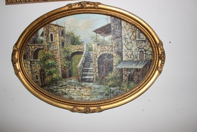 Quadro Dipinto Paesaggio Unico Cortile Cornice Ovale In Legno Oro Antico Barocco Ebay