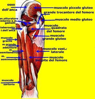 Retto femorale vasto mediale vasto. Origina dalla tuberosità ischiatica e si inserisce in un piccolo tubercolo sopra la metà della cresta trocanterica del femore e nell osso. Il muscolo quadrato del femore appiattito e quadrangolare formato da fasci paralleli trasversali da ischio al femore chiude la descrizione della regione glutea. Il muscolo quadrato del femore è uno dei muscoli esterni dell anca.