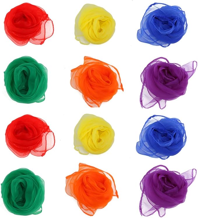 Amosfun 12 Pezzi Quadrati Sciarpe Da Ballo Giocoleria Sciarpa Oggetti Di Scena Scialle Sciarpa Borsa Per Capelli Fascia Da Polso Per Bambini Asilo Prestazioni Colori Misti Amazon It Abbigliamento