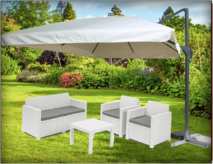 Palo ø 38 35 mm con snodo 4 balene fusto color bianco poliestere 180 grammi colore ecrù. Un ombrellone quadrato da 3x3m riuscirà a creare un area d ombra sufficientemente grande sotto la quale posizionare un salottino da esterno o organizzare una zona pranzo en plein air. Ombrellone in alluminio da giardino inclinabile. Alicante struttura in alluminio girevole 360 gradi copertura in poliestere 235 gr mq beige azionamento a manovella cuspide antivento completo di base in granito 80 kg palo a sezione quadrata 68x68 mm 8 stecche alluminio 17x22 mm dimensioni.