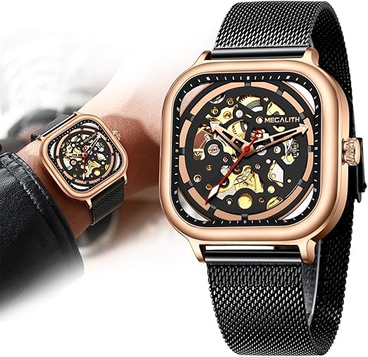 Megalith Orologio Uomo Orologio Da Polso Militare Automatico Meccanico Impermeabile Scheletro Quadrato Nero Acciaio Orologi Mesh Blu Elegante Analogici Design Amazon It Orologi