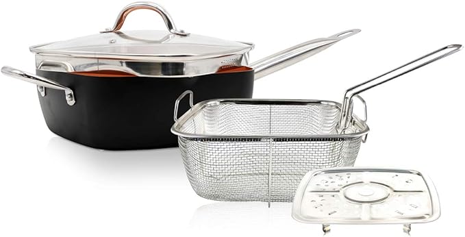 Padella Quadrata Rivestimento Rame Con Coperchio Piu Cestello Per Friggitrice