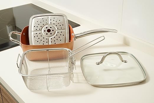 Padella Quadrata In Rame Antiaderente Con Coperchio Di Vetro E Cestello Per Fritture Adatta Anche All Induzione