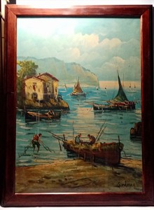 Quadro Olio Su Tela Paesaggio Marino Con Pescatori Cornice Legno Antico In Vetro Ebay