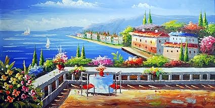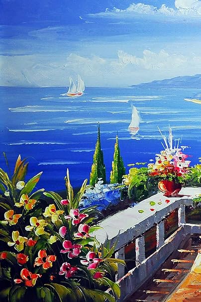 Quadro Stampa Su Tela Mare Barca Balcone Fiori Montagna Cielo Paesaggio Marino Dipinti Decorazione Da Parete 40x60 Cm Amazon It Casa E Cucina