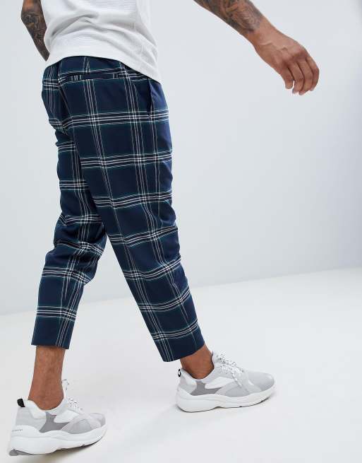 Bershka Pantaloni Blu Navy A Quadri Con Risvolti Navy Stileo It