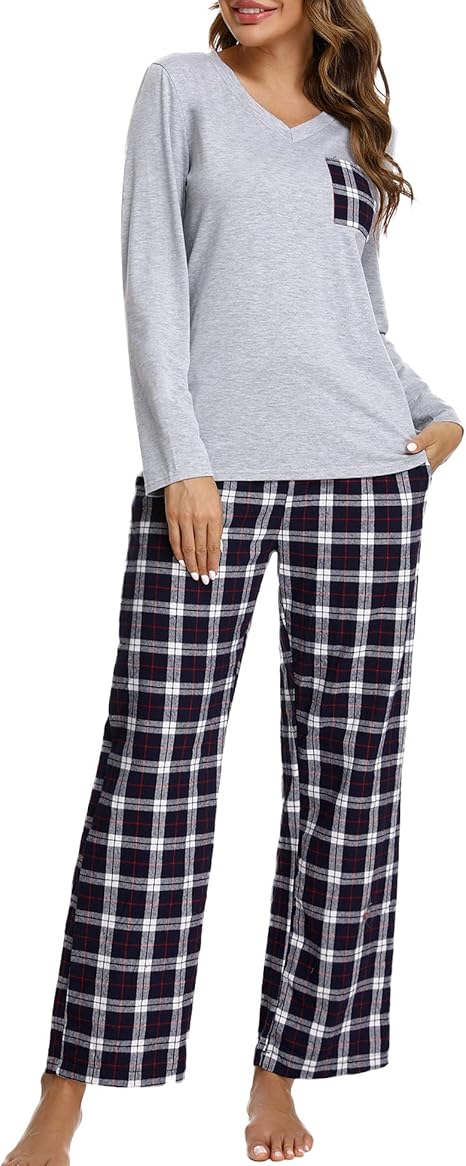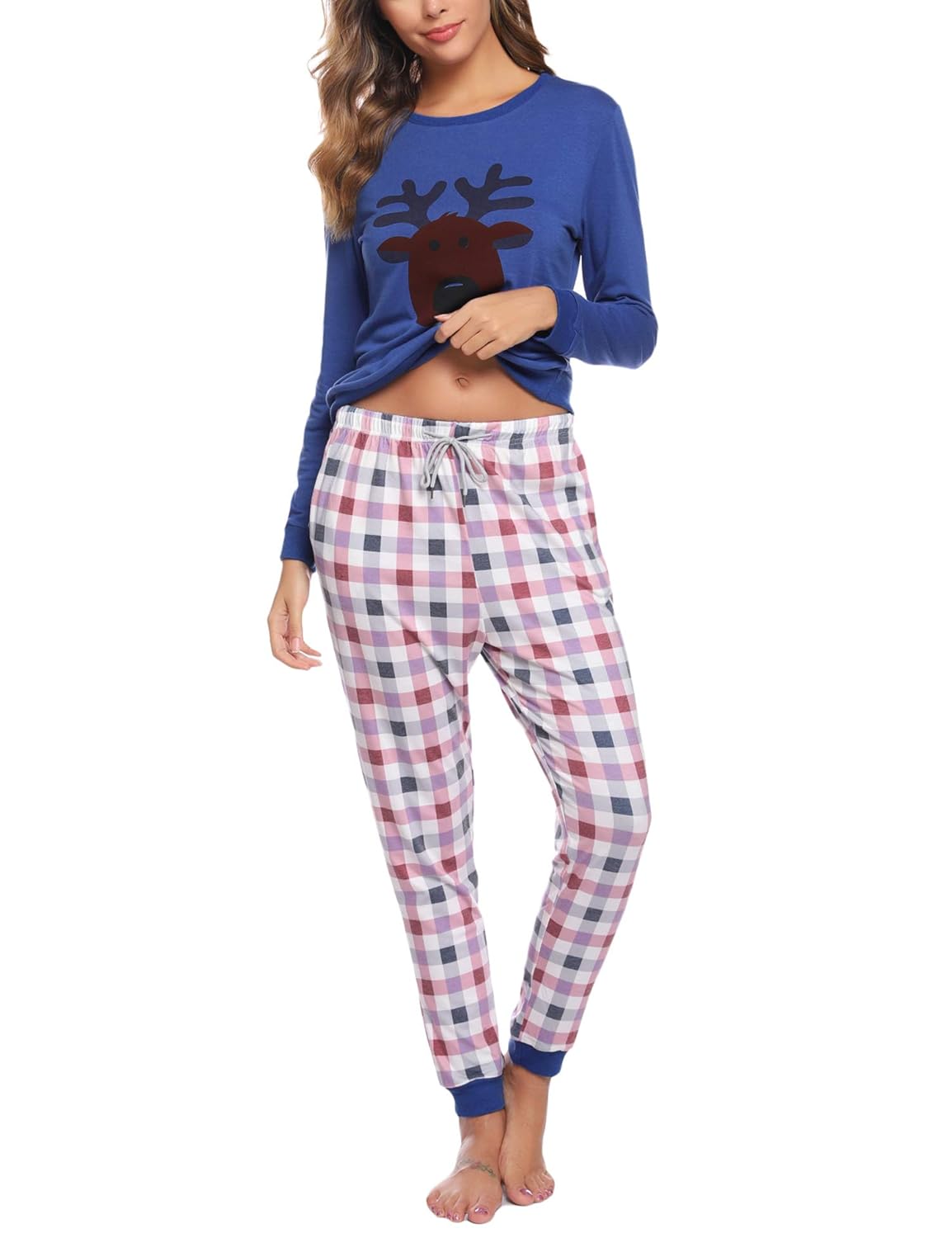 Aibrou Pigiama Donna Inverno Cotone Pantaloni In Cotone A Quadri E Set Di Cervi Con Motivo