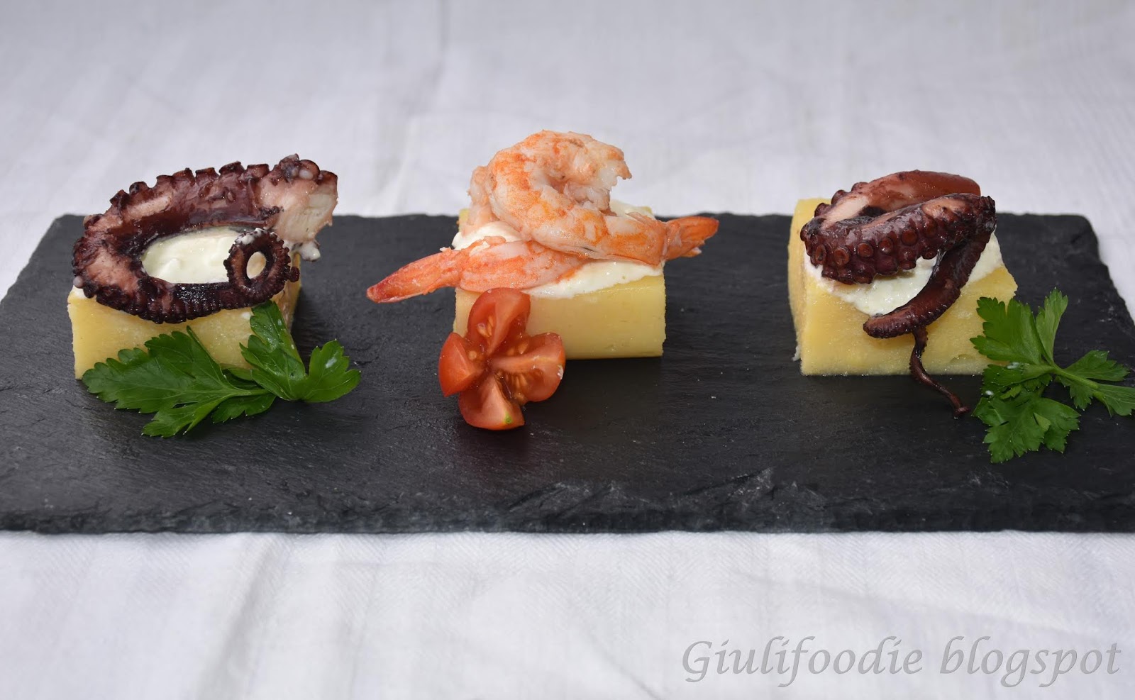 Giuli Foodie Le Mie Ricette In Cucina Crostini Di Polenta Con Crema Di Burrata Polpo Arrostito E Mazzancolle