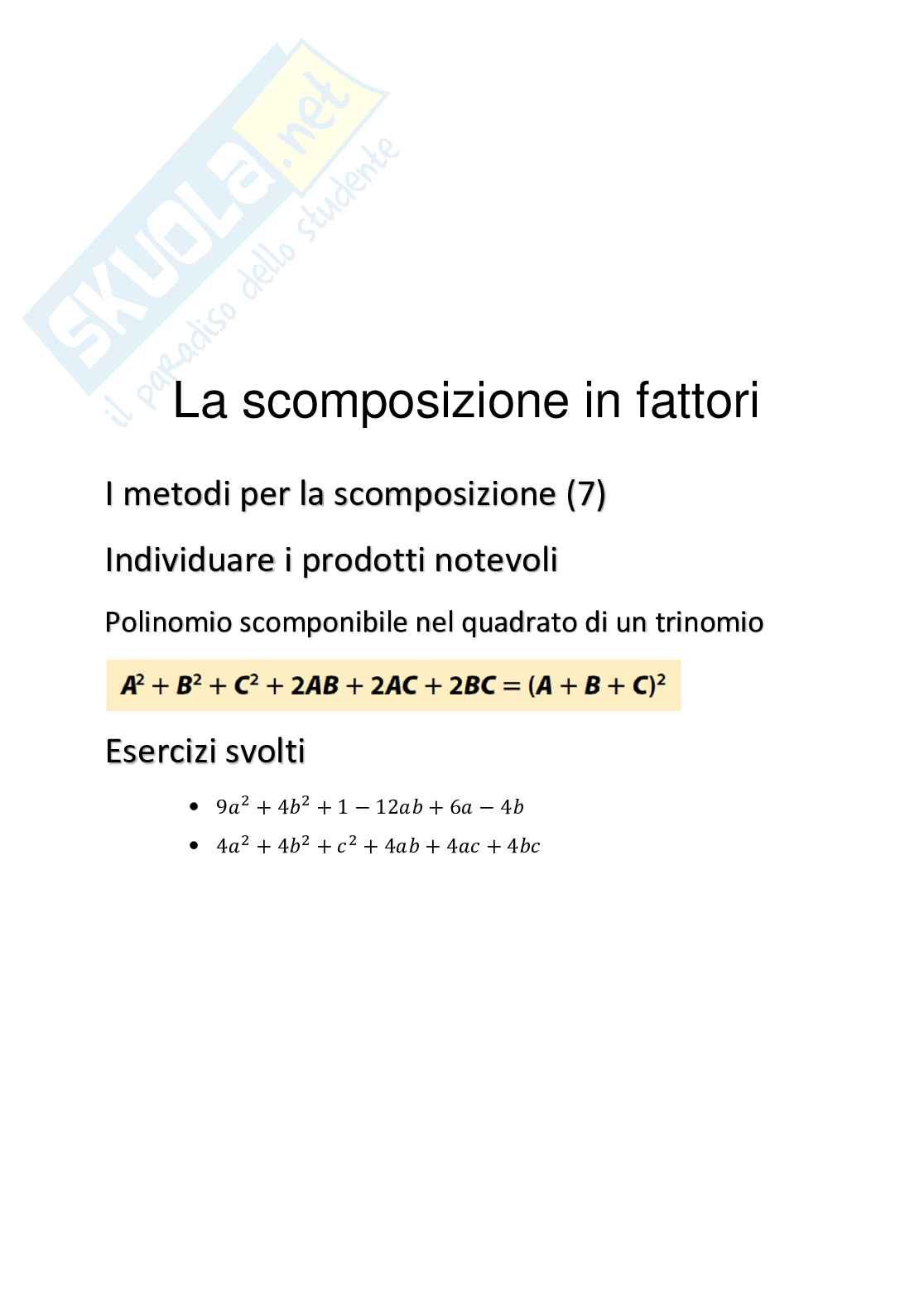 Scomposizione secondo il quadrato del trinomio e una delle piu facili da individuare perche il polinomio di partenza ha un elevato numero di termini sei l unica difficolta e mettere i segni giusti. Svolgimento di due e. Naturalmente si ottiene leggendo a rovescio la regola per ottenere il quadrato del trinomio a b c 2 a 2 b 2 c 2 2ab 2ac 2bc cioe. Il quadrato di un trinomio è un prodotto notevole che permette di calcolare il quadrato di polinomi composti da 3 monomi.