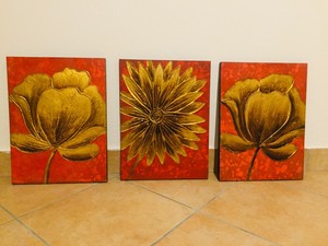 3 Quadri Dipinti A Mano Olio Su Tela Fiori Oro Su Fondo Rosso Ebay