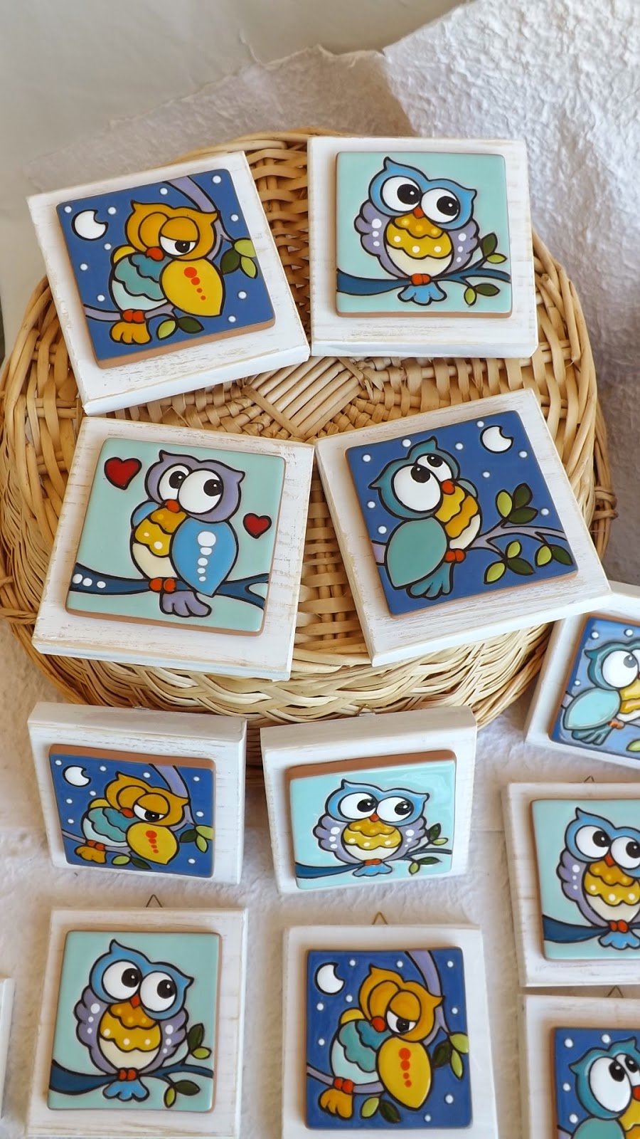 Ceramica Come Mestiere Mattonelle Con Gufi Su Legno Massello Un Originale Quadretto Idea Bomboniera O Regalo