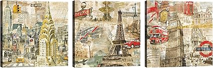 Quadri Parigi Londra New York 3 Pezzi 30x30 Cm Stampa Su Tela Con Telaio In Legno Arredamento Arte Arredo Moderno Amazon It Casa E Cucina