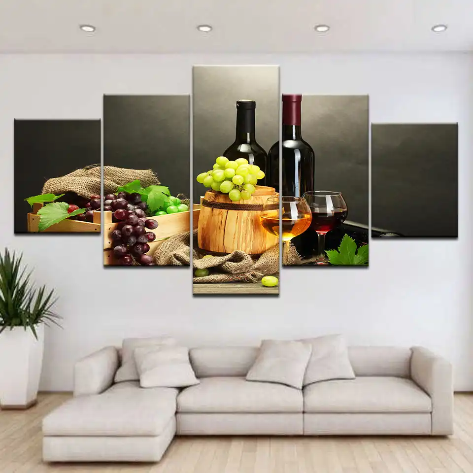 Quadri Su Tela Stampe Hd Cucina Decor 5 Pezzi Uva Bottiglia Di Vino Dipinti Di Frutta E La Tazza Poster Ristorante Quadro Di Arte Della Parete Pittura E Calligrafia Aliexpress
